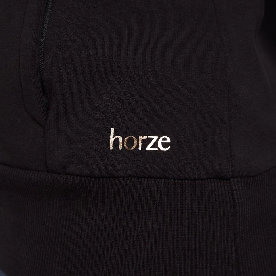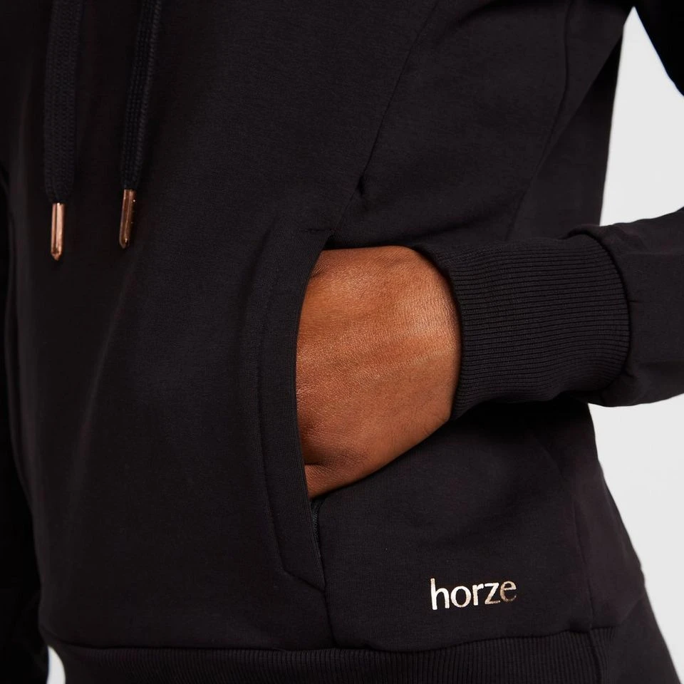 The Horze Remy sweatshirt is made from soft flexible organic cotton. The high collar keeps out the cold, and zipped pockets keep any valuable secure and your hands warm. It also has a small gold Horze logo near the bottom hem of the sweatshirt.